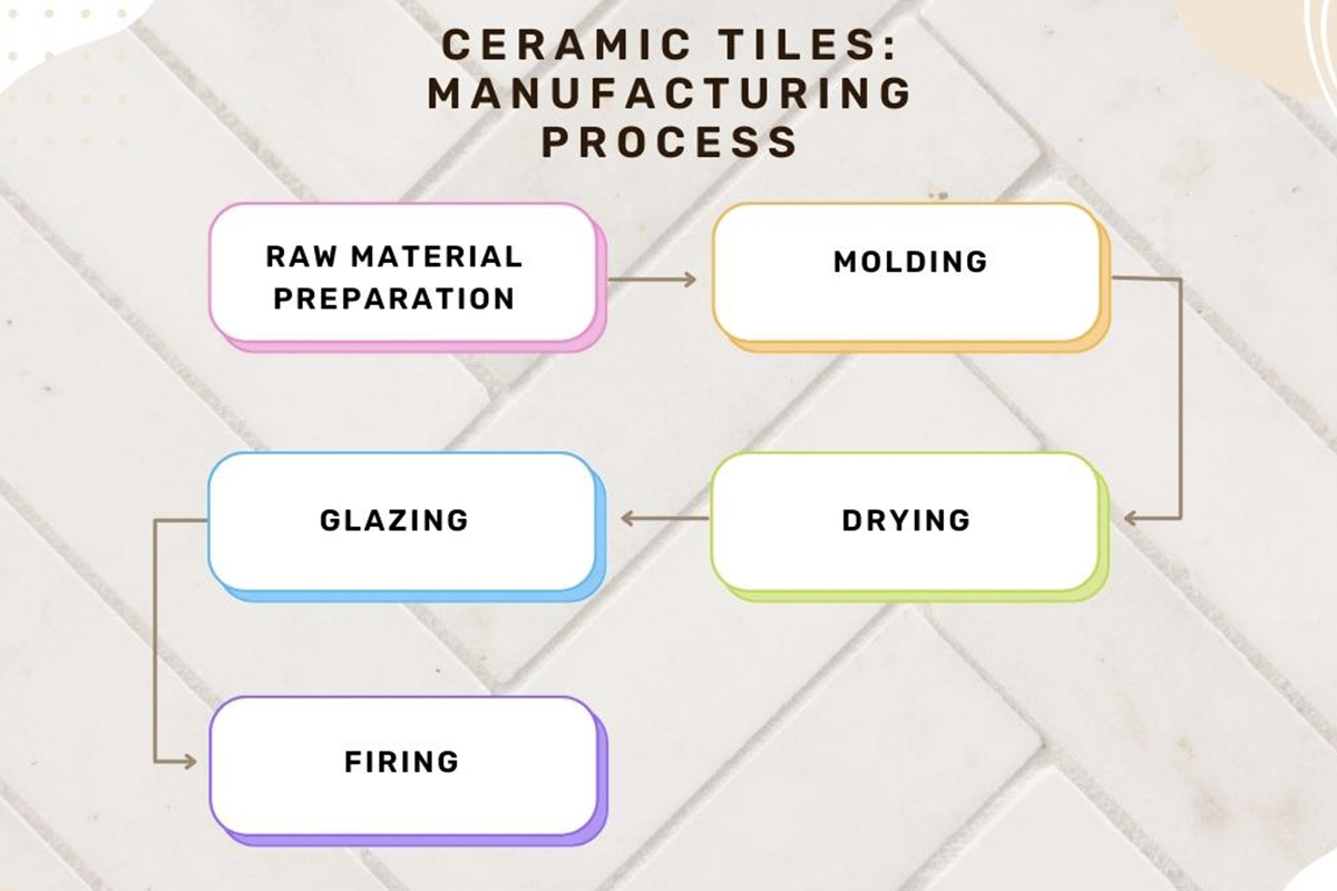 There are 5 major steps in the ceramic tile manufacturing process- Raw material preparation, molding, drying, glazing & firing. Let’s understand each step in detail:
