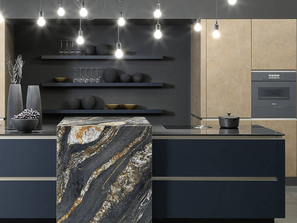 The classic polished granite counters are beautiful, practical, and elegant. Practical because they are more durable and if you love to cook, you would be delighted to know that the stone surface resists stains, scratches, and heat. When we say polished finish, think of a large island that can be easily turned into a chic dining space or transformed into a grub hub for parties.